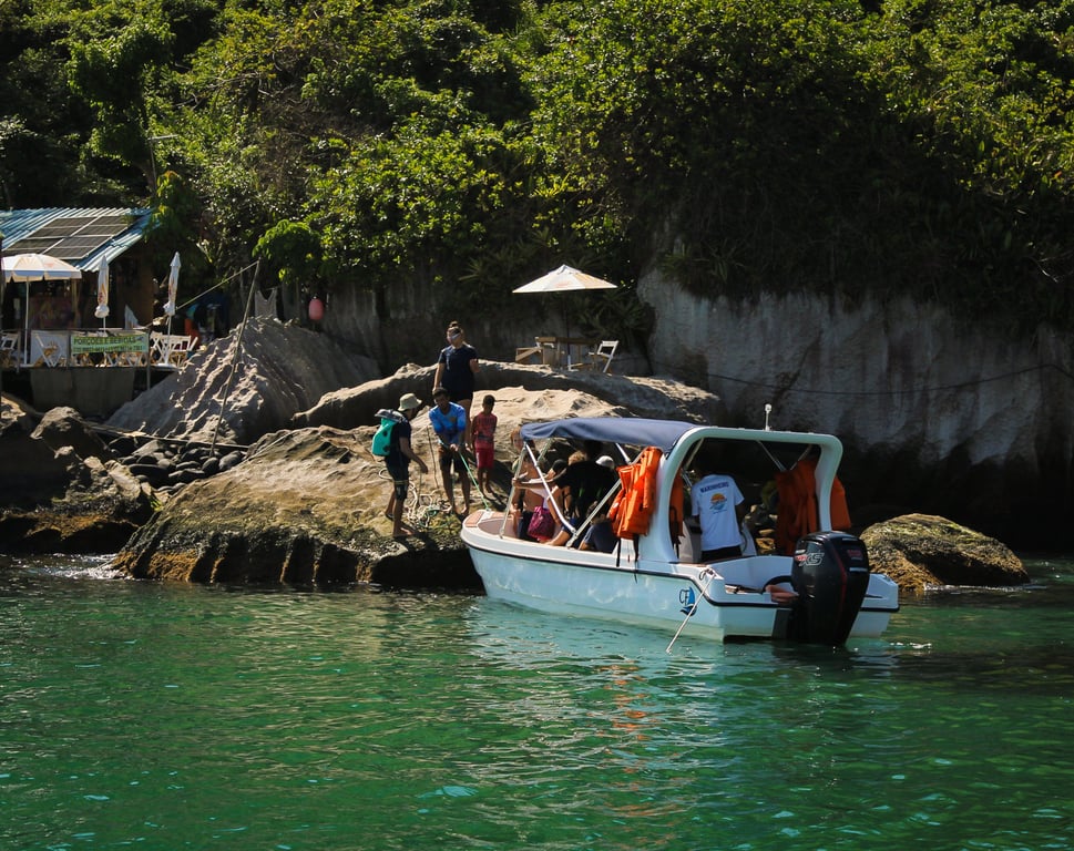O passeio é realizado em lancha privativa garantindo exclusividade total ao grupo em lancha CF 27 pés, motor 120 hp (capacidade até 16 passageiros) ou lancha Vittare 21 pés, motor 115 hp (capacidade até 10 passageiros), conforme disponibilidade. As embarcações são regularizadas e equipadas para oferecer segurança, conforto e excelente performance, proporcionando um passeio de lancha exclusivo no Litoral Norte SP.