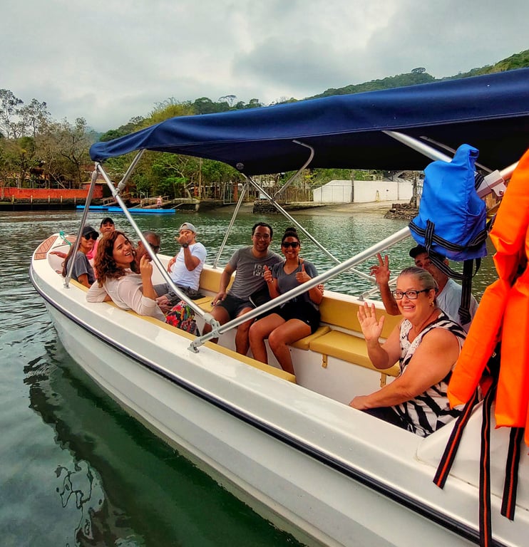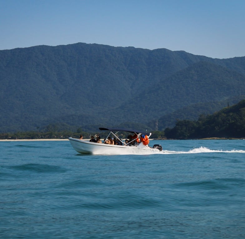O passeio pode ser realizado em lancha CF 27 pés, motor 120 hp (capacidade até 16 passageiros) ou lancha Vittare 21 pés, motor 115 hp (capacidade até 10 passageiros), conforme disponibilidade.