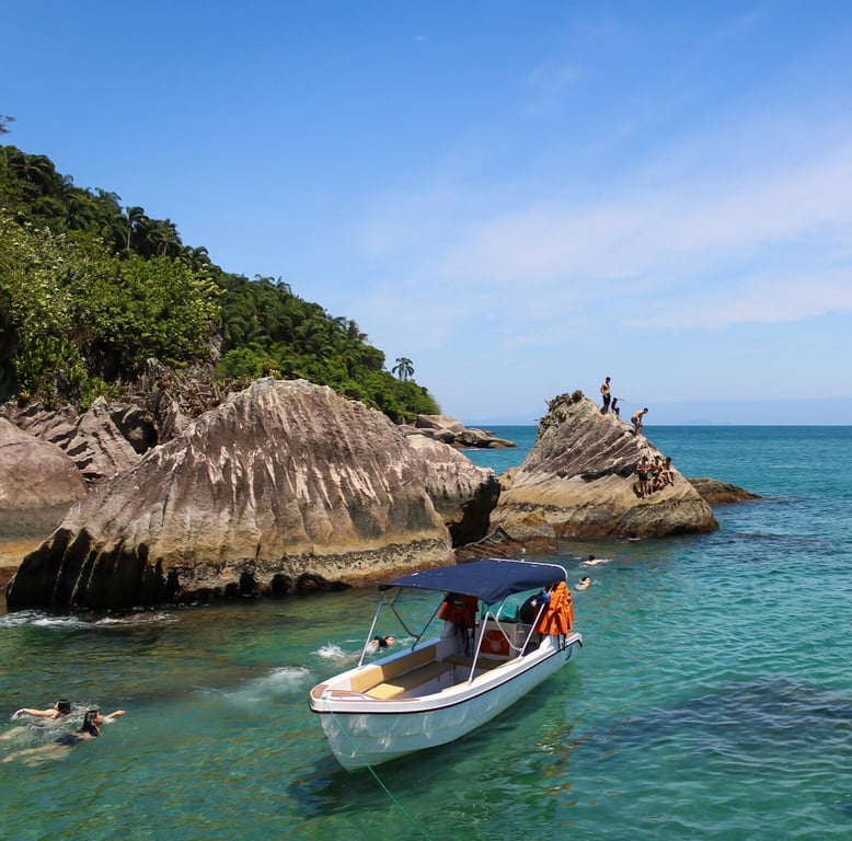 Ilha das Couves — Piscina natural de águas claras e tranquilas, ideal para nadar e contemplar a vida marinha durante o passeio de lancha no Litoral Norte SP. (aprox. 15 min)
