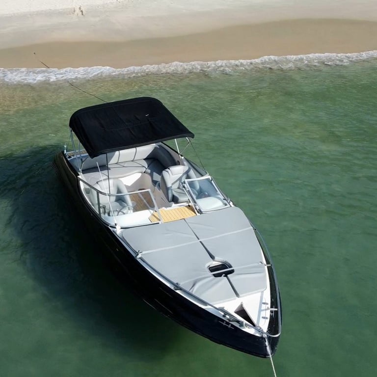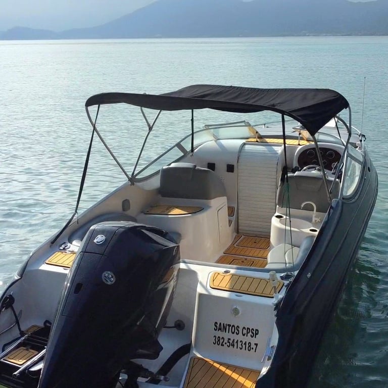 A lancha oferece navegação suave e confortável, equipada com banco solarium na proa, bancos de couro, cabine com banheiro, som ambiente, ducha de água doce e capota com proteção UV.